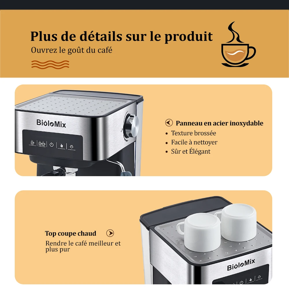 【Assurer les meilleures FLAVOES】: 20 bars est la pression standard pour brasser un expresso au goût riche, avec la pompe haute pression, la pression de l'eau instantanément à travers la poudre de café, ce qui assure la haute qualité de l'espresso à chaque fois.