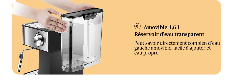 【Réservoir d'eau déhoussable】: 1,6l grand réservoir d'eau amovible avec une fenêtre d'eau claire, pratique pour vous de surveiller les niveaux d'eau et vous assurer que votre cafetière fonctionne efficacement. Et détartrer régulièrement aide à éliminer le tartre et à assurer un fonctionnement efficace de la cafetière.